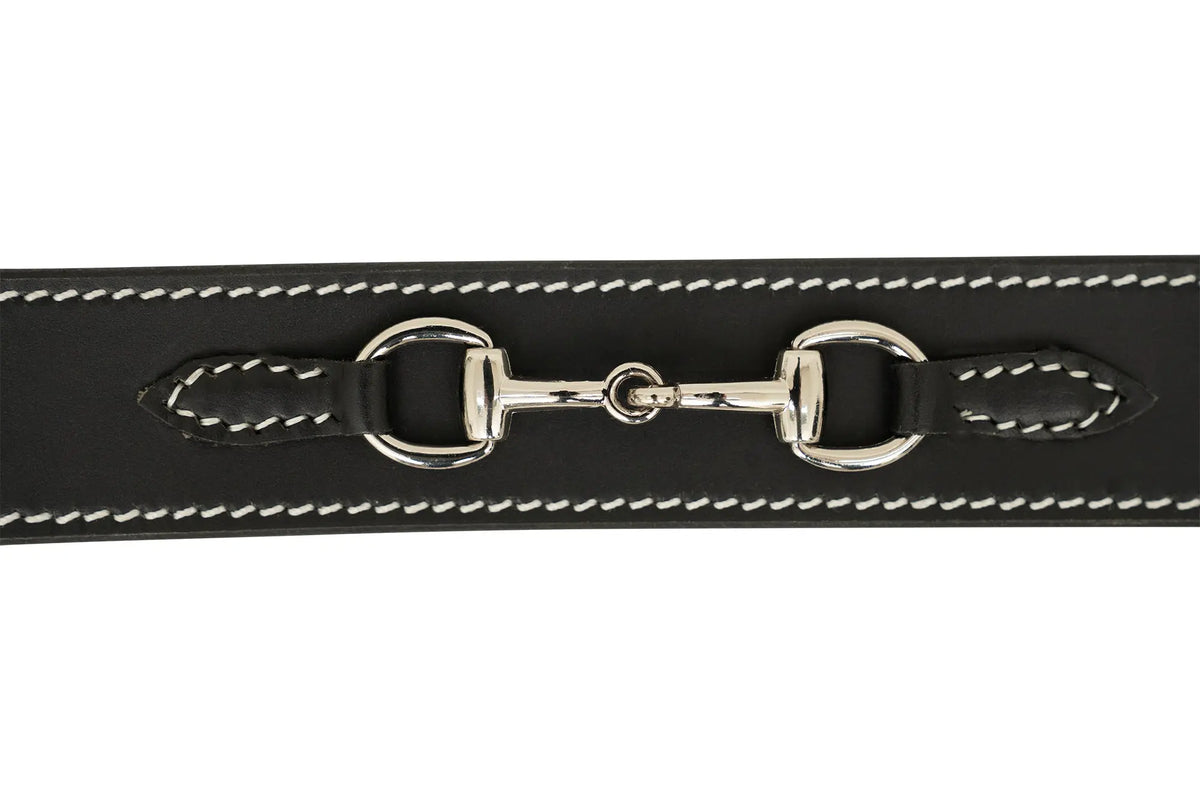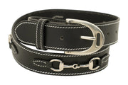 Elevate your style with the Huntley Equestrian Ladies Black Leather Belt, featuring a sophisticated stirrup buckle and classic snaffle bit design. Crafted from premium full-grain leather, this 1.5-inch width belt offers both durability and a polished finish that pairs effortlessly with breeches, denim, or tailored outfits.