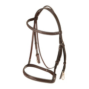 Huntley Equestrian Sedgwick Leather Fancy Stitched Bridle with stainless steel Cheek Clips for easy access to changing the bit. This bridle includes a pair of fancy stitched laced reins. Available in Full and Cob sizes. Sedgwick Havana color.