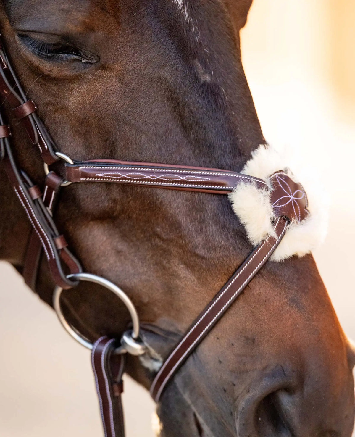 The classic Figure 8 noseband, complete with sheepskin center, offers both style and function, helping to encourage suppleness while maintaining control. Beautifully finished with meticulous stitching and stainless steel hardware, this bridle embodies the perfect balance of durability, elegance, and traditional equestrian craftsmanship.