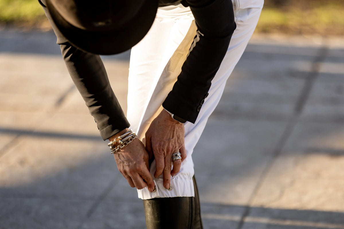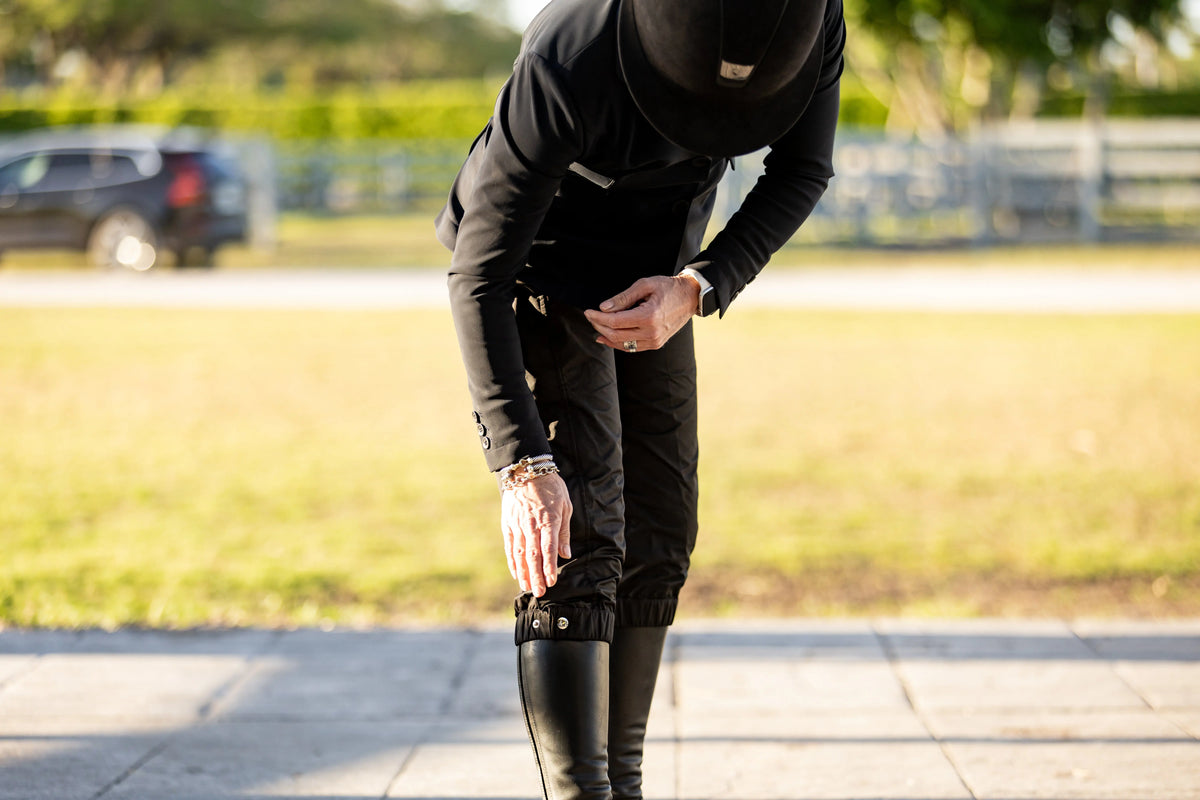 The Grand Prix Rain Pants are a lightweight, waterproof, and windproof solution with a 3/4 length design to protect riders from the waist down to the top of the boot. Featuring an expandable and adjustable waist for a comfortable fit, these rain pants are practical and easy to wear. The zippered legs run from waist to cuff, allowing for effortless slipping on over boots, while velcro closures secure the zipper covers neatly. The adjustable cuffs ensure a snug fit around the boot tops. Available in Black, Beige and White. The rain pants come in sizes XS, S, M, L, and XL.