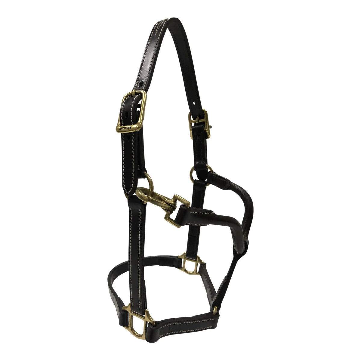 The Huntley Equestrian Fancy Stitched Adjustable Premium leather pony halter is crafted with Italian leather with solid brass hardware. The Huntley Pony leather halter is elegant and durable for everyday use in the barn and at shows. The Huntley Pony leather halter features an adjustable crown piece on both sides for the perfect fit and a rolled throat piece with a brass clip for easy on and off use. Each pony halter features durable stitching along the edges of the leather, crown and nose pieces include a fancy stitched design. The Huntley Fancy Stitched Premium Leather Pony halter will compliment any pony with the beautiful brown leather and brass hardware. Easy to use, durable, classically designed for everyday use or the show ring.