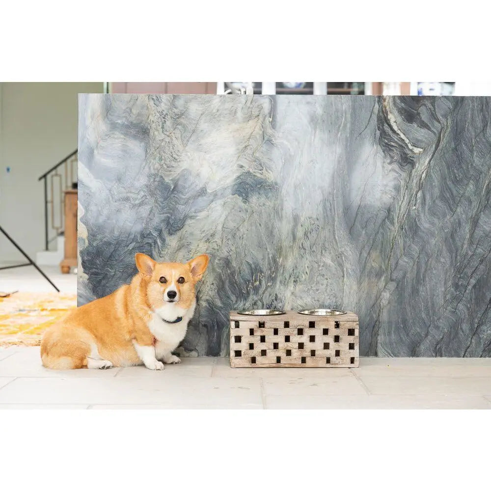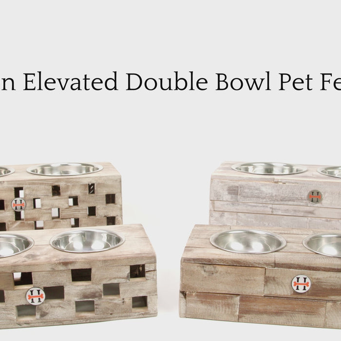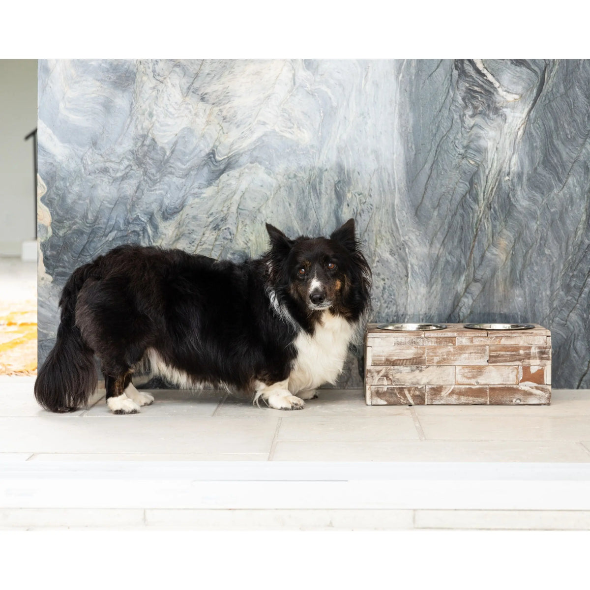 Promotes pet Wellness: designed and constructed with modern, reclaimed materials to safely hold two stainless bowls, elevated to a comfort height for your pet.