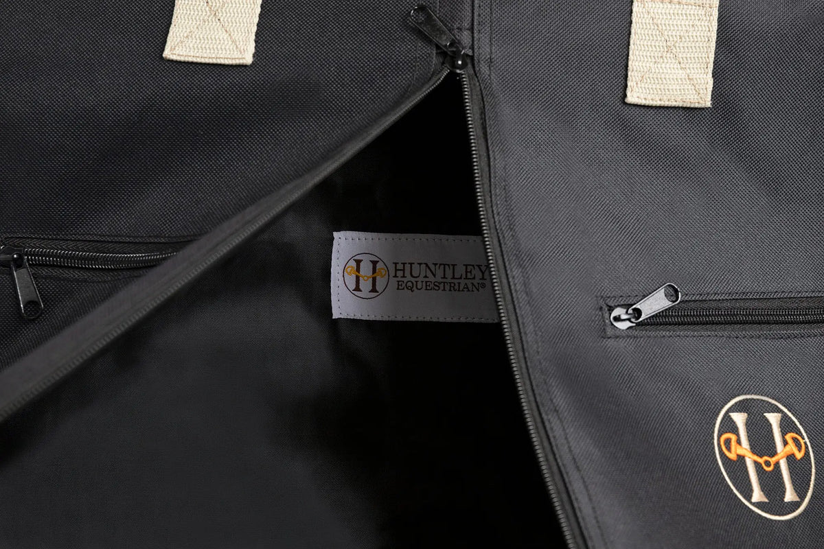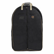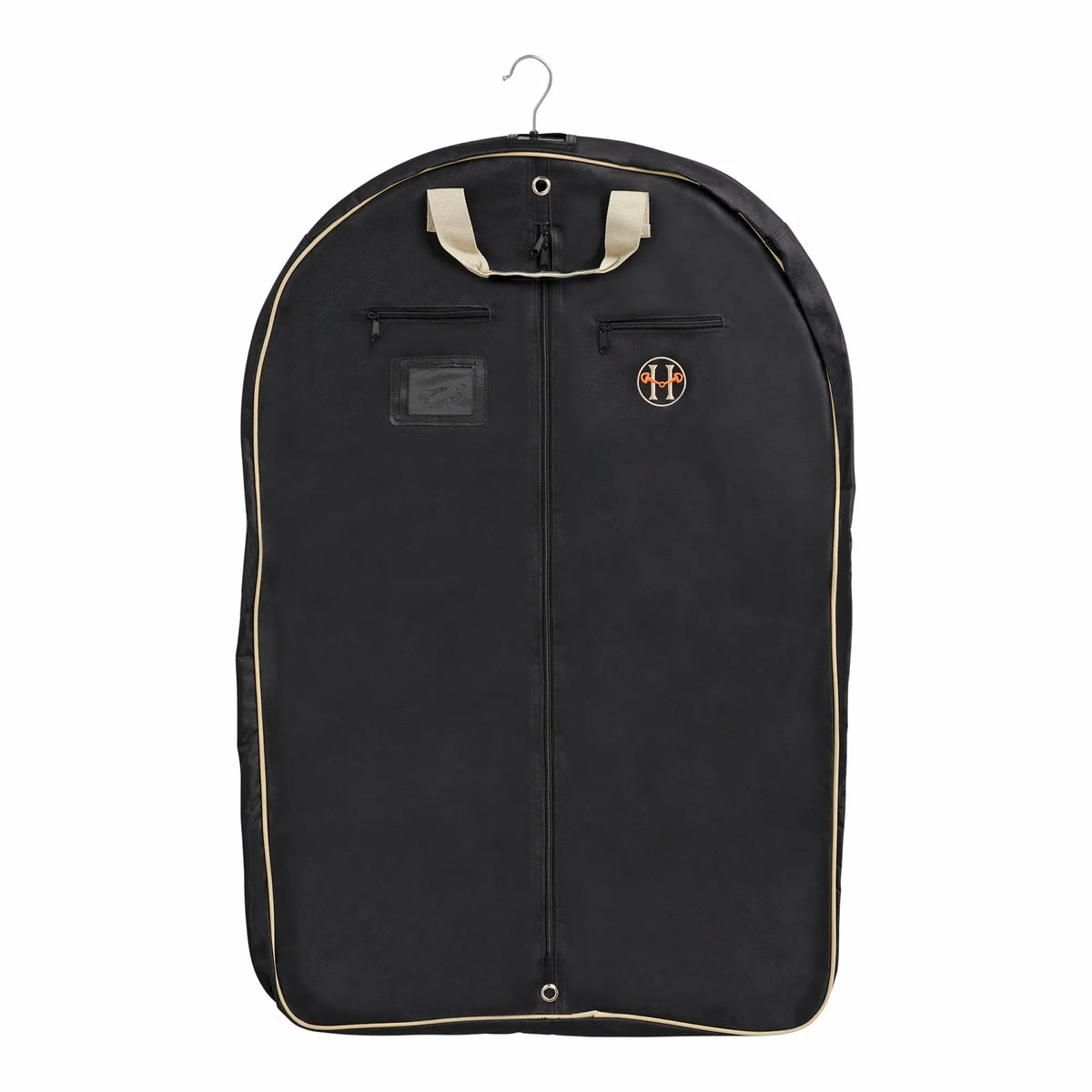 Huntley Equestrian Deluxe Black Travel Carry On Garment Bag combines high performance nylon with roomy features that can hold multiple coats, shirts, and breeches. Exterior features include 2 accessory zip pockets, card holder, and 2 durable straps with reinforced handles. Interior features include plenty of room for all of your equestrian clothes. A clear, small compartment hanging bag with a hoop feature can hold all of those small items needed for dressing for the ring. This garment bag will protect your valuable equestrian clothes and travels easy with the foldable feature. A beautiful finish to your traveling equestrian bag collection.