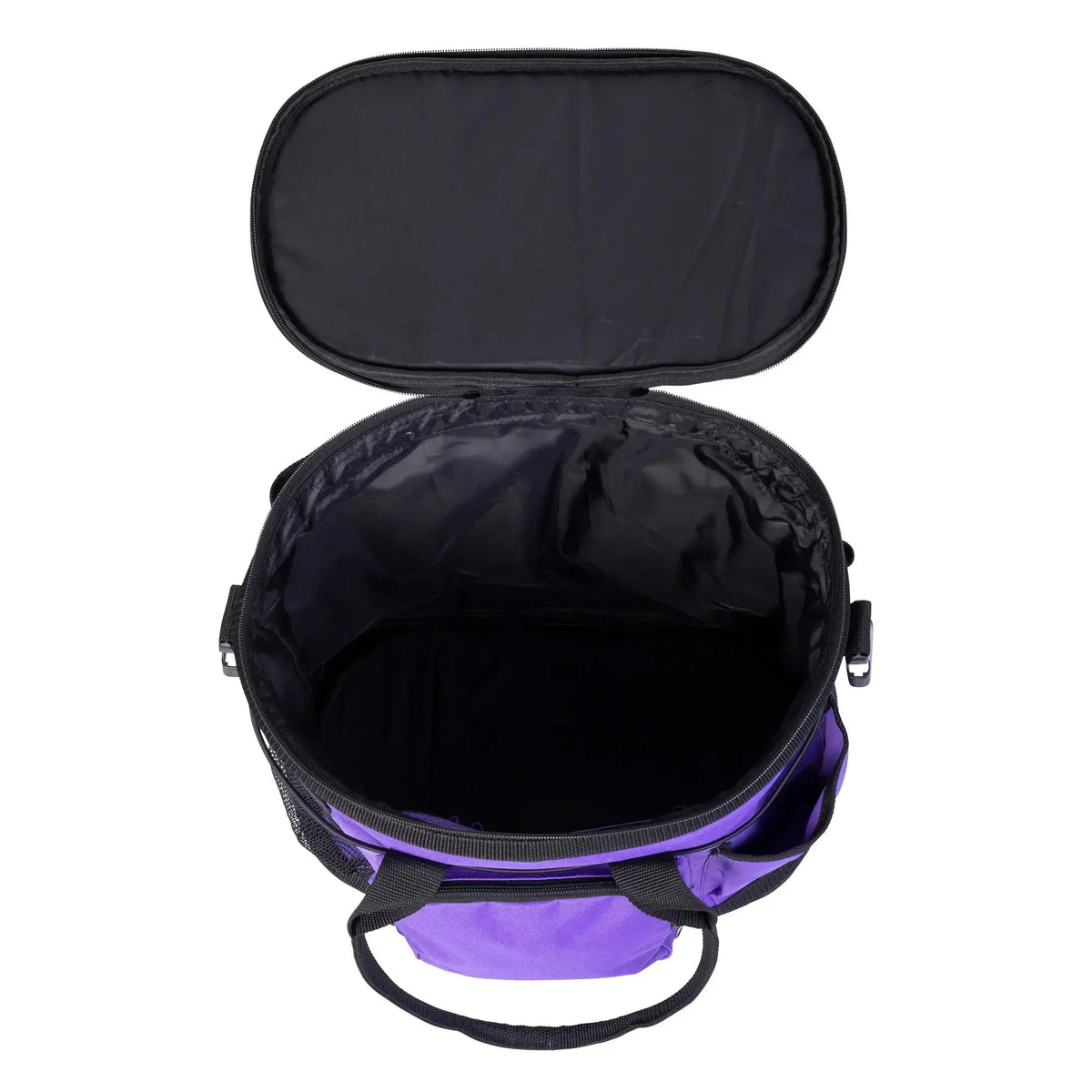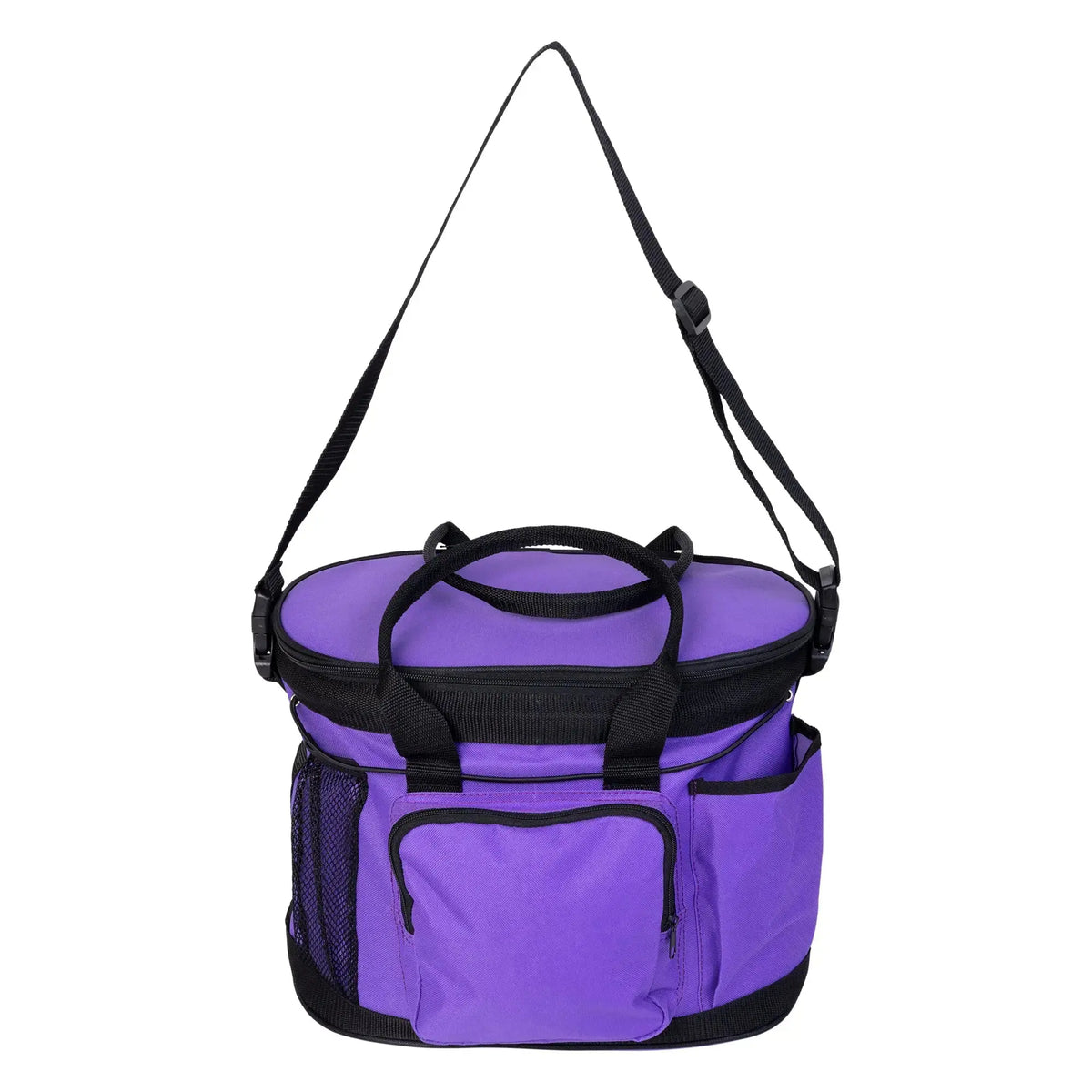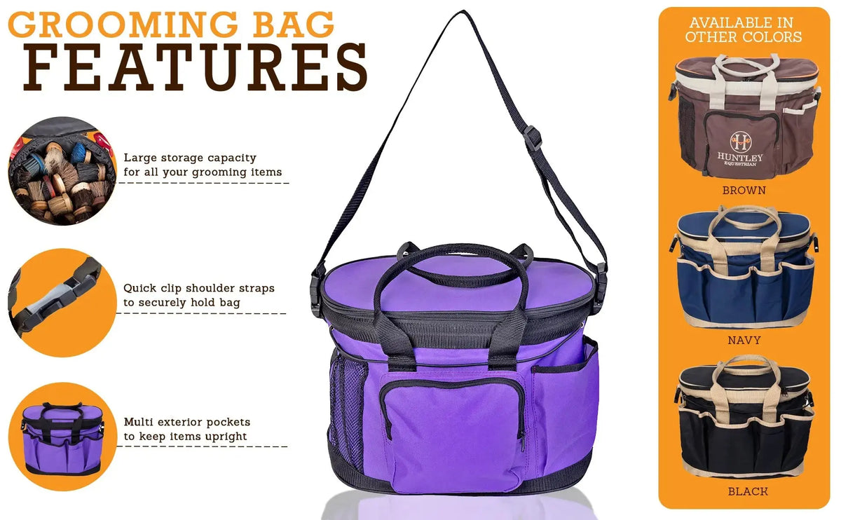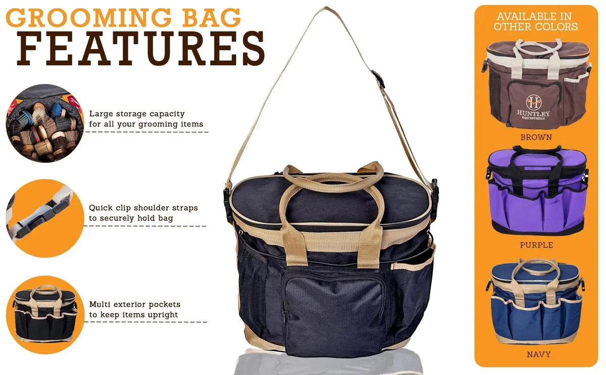 Huntley Equestrian Deluxe Grooming Bag Multi pocket, light weight brown nylon grooming bag designed to hold all of your grooming needs, complete with name label and pen holders inside. The deluxe bag features 9 various exterior pockets to hold bottles, brushes, hoof picks and other products. An elastic string is attached along the exterior to secure the products to the bag. Features include two durable nylon handles with a zippered closure, choice of quick clip shoulder straps. The straps will enable you to carry the saddle, bridle, and other objects while keeping your hands free. Zippered closure at the top keeps the inside storage dry and dust free. Inside zipper safety compartment for cell phone/money. Interior hard base to support products and able to fold for easy storage. Exterior studded base to keep off the ground and upright. This beautiful, well designed grooming bag is made of tough ballistic nylon for washability and extended years of use. Store your brushes here! Available in colors Black, Navy Blue, Brown, and Purple.