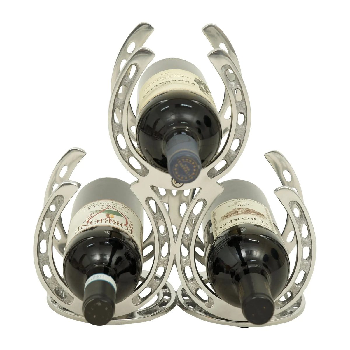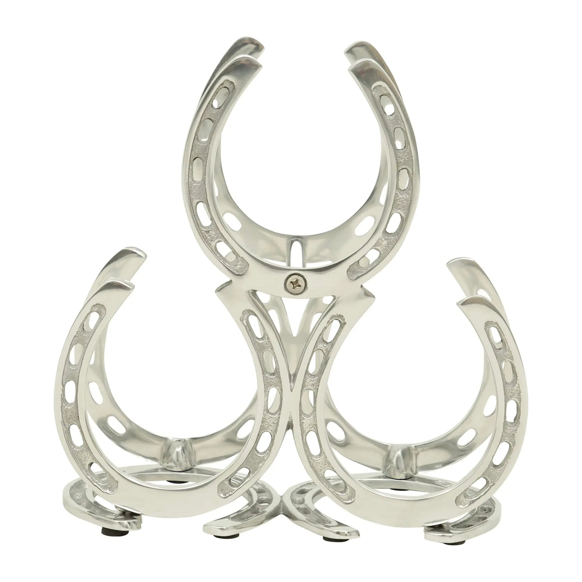Huntley Horseshoe 3-Bottle Wine Rack, a perfect blend of rustic charm and modern elegance. Crafted from durable aluminum with a sleek silver finish, this wine rack features an artful arrangement of horseshoes, symbolizing luck and equestrian sophistication. Designed to securely hold up to three standard-sized wine bottles, it adds a stylish touch to any kitchen, bar, or dining area. Whether you're a wine enthusiast, an equestrian lover, or looking for a unique gift, this wine rack is both a functional and decorative statement piece.